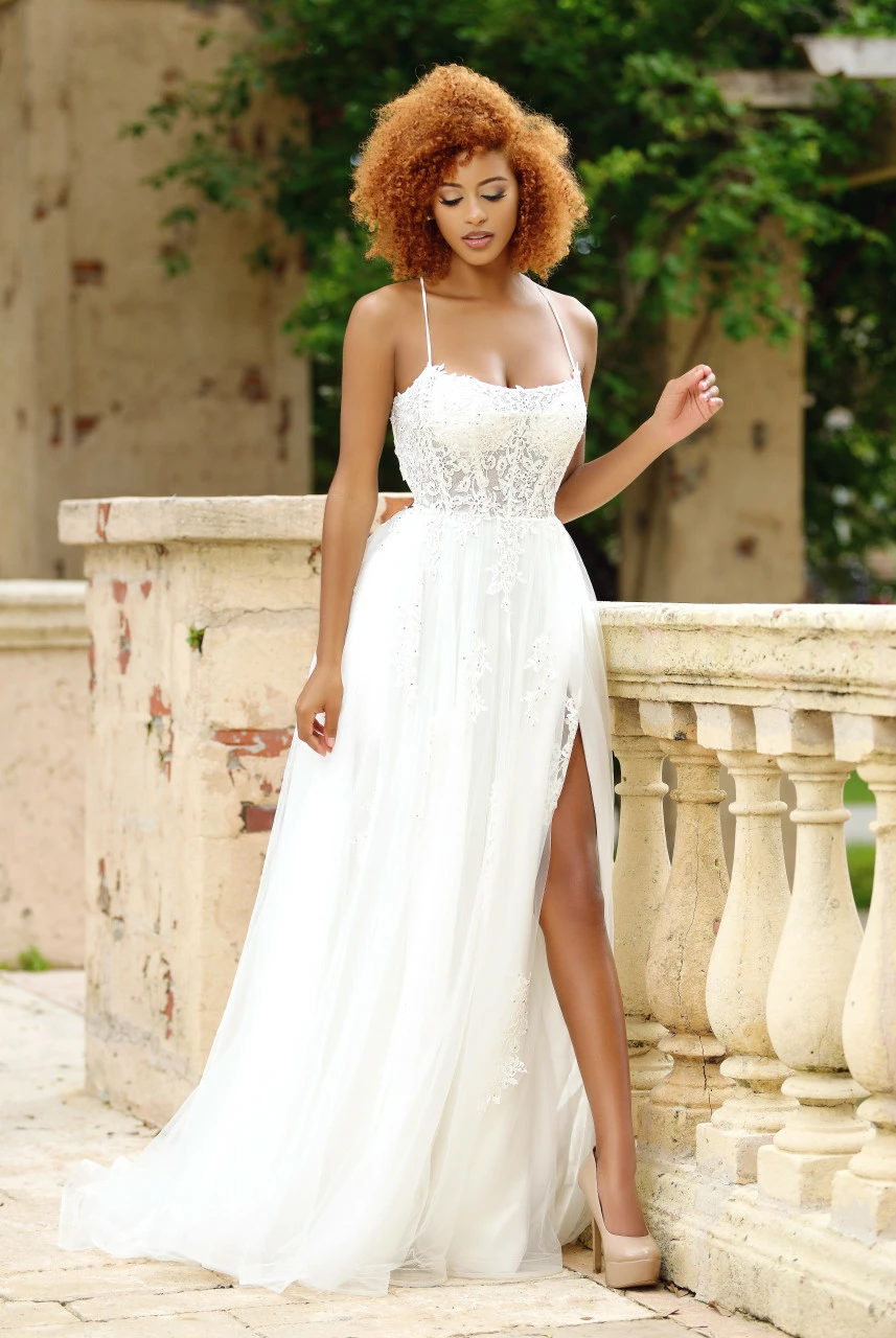 The Alisha Gown in Ivory is a romantic tulle A line gown with is straight neckline with intricate lace scalloping details throughout the bodice. These lace details carry into the skirt with carefully place floral appliques throughout the skirt.