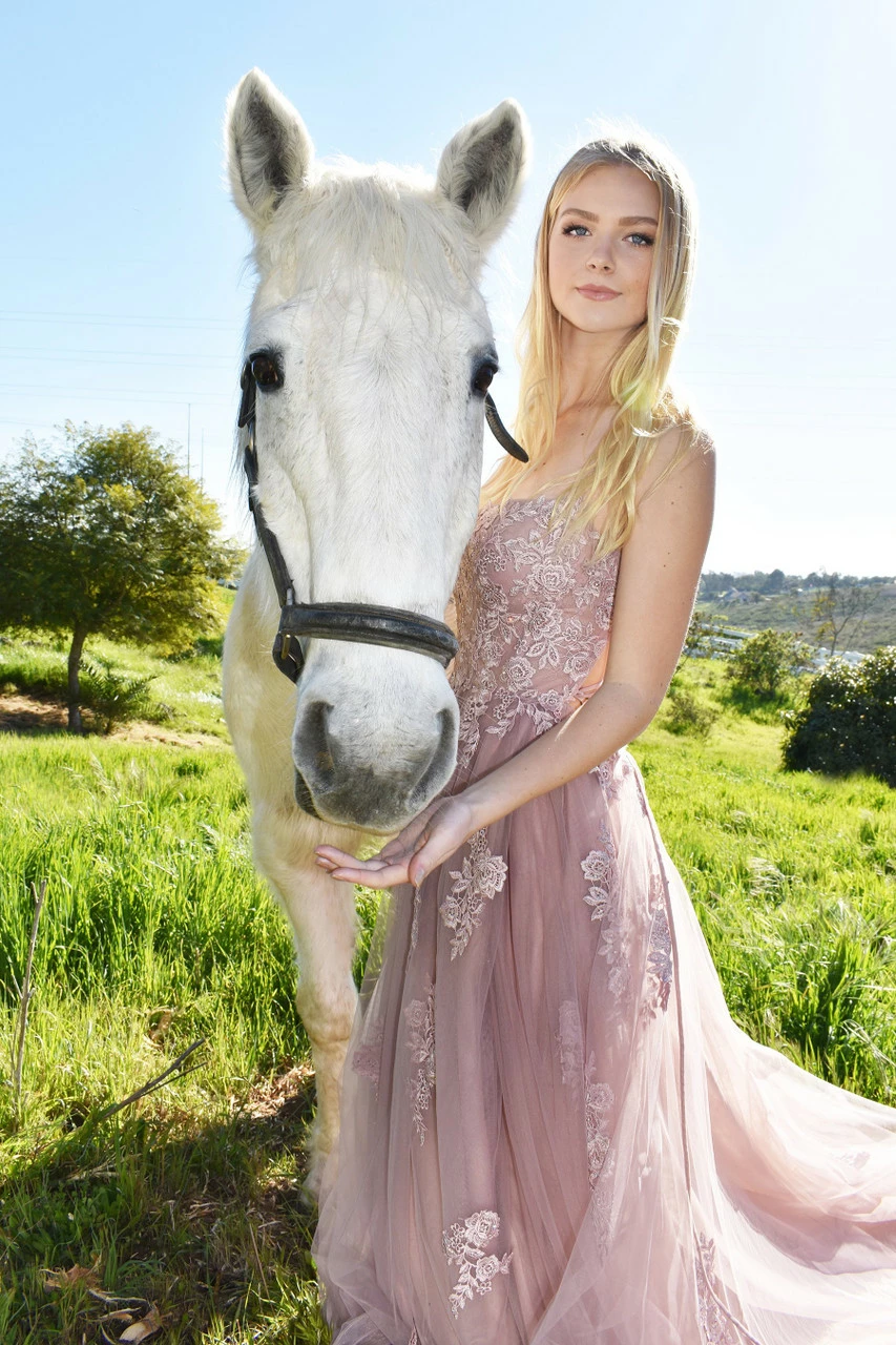 The Alisha Gown is a beautiful tulle A line gown with is straight neckline with intricate lace scalloping details throughout the bodice. These lace details carry into the skirt with carefully place floral appliques throughout the skirt.