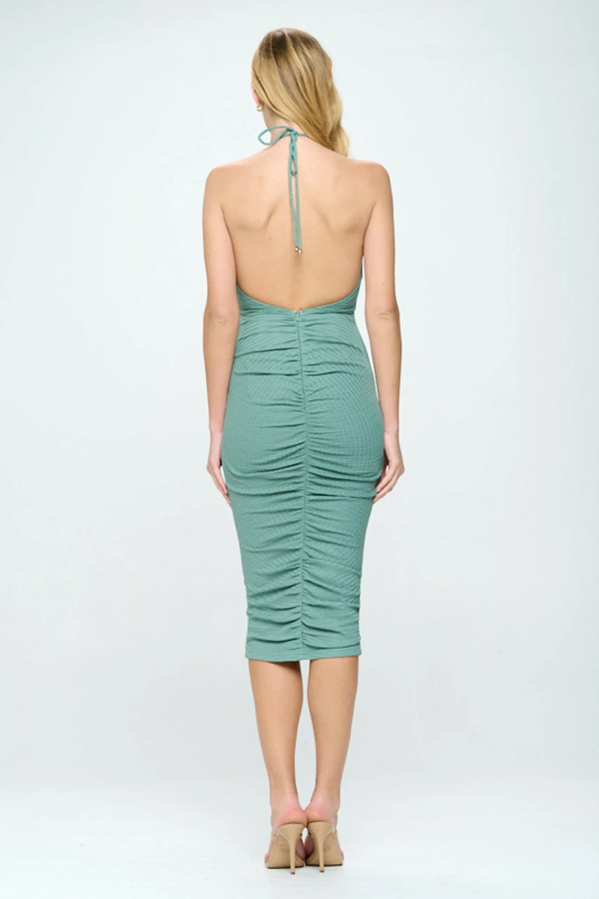 This curve-hugging dress was made for sunset happy hour! It features a halter v-neckline with a center cropped cutout under the bust, and a textured ruched design in front and back. Dress it up or down with with classic hoop earrings and strappy heels or a wedge!