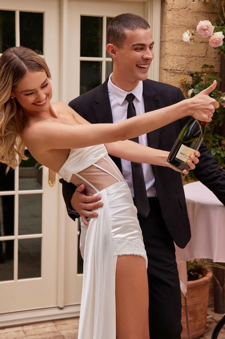 The Dylan gown is a sexy strapless corset satin gown! This gown is a mix of glamour with a fashion forward look. The sheer boned corset adds a little bit of glam with the crystal edged bust followed by a plunging neckline. The gathered waistline with an embellished side slit will show off all of your curves. This gown will have you make a memorable entrance and have people asking where they can get one just like it!