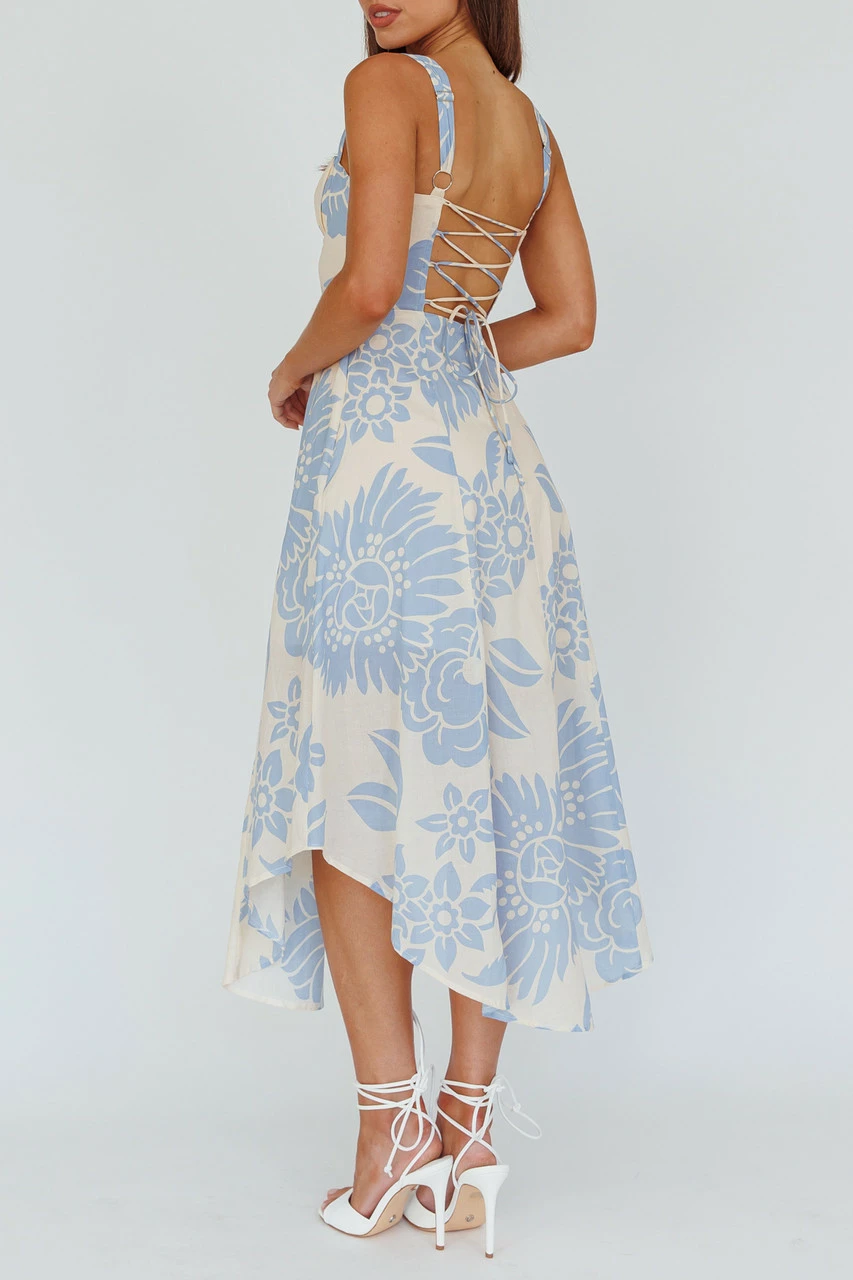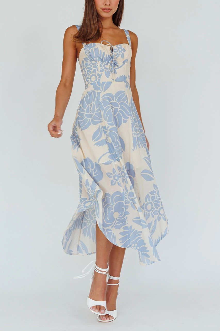 A lovely midi sundress in a fit-and-flare silhouette distinguished by a fresh floral print, a sweetheart double tied front neckline with ruched details, and corset boning. A lace-up back design, hidden side zipper and adjustable shoulder straps that keep this sweet sleeveless midi dress elegant. To complete your garden party outfit, add a simple pair of strappy sandals of your choice.