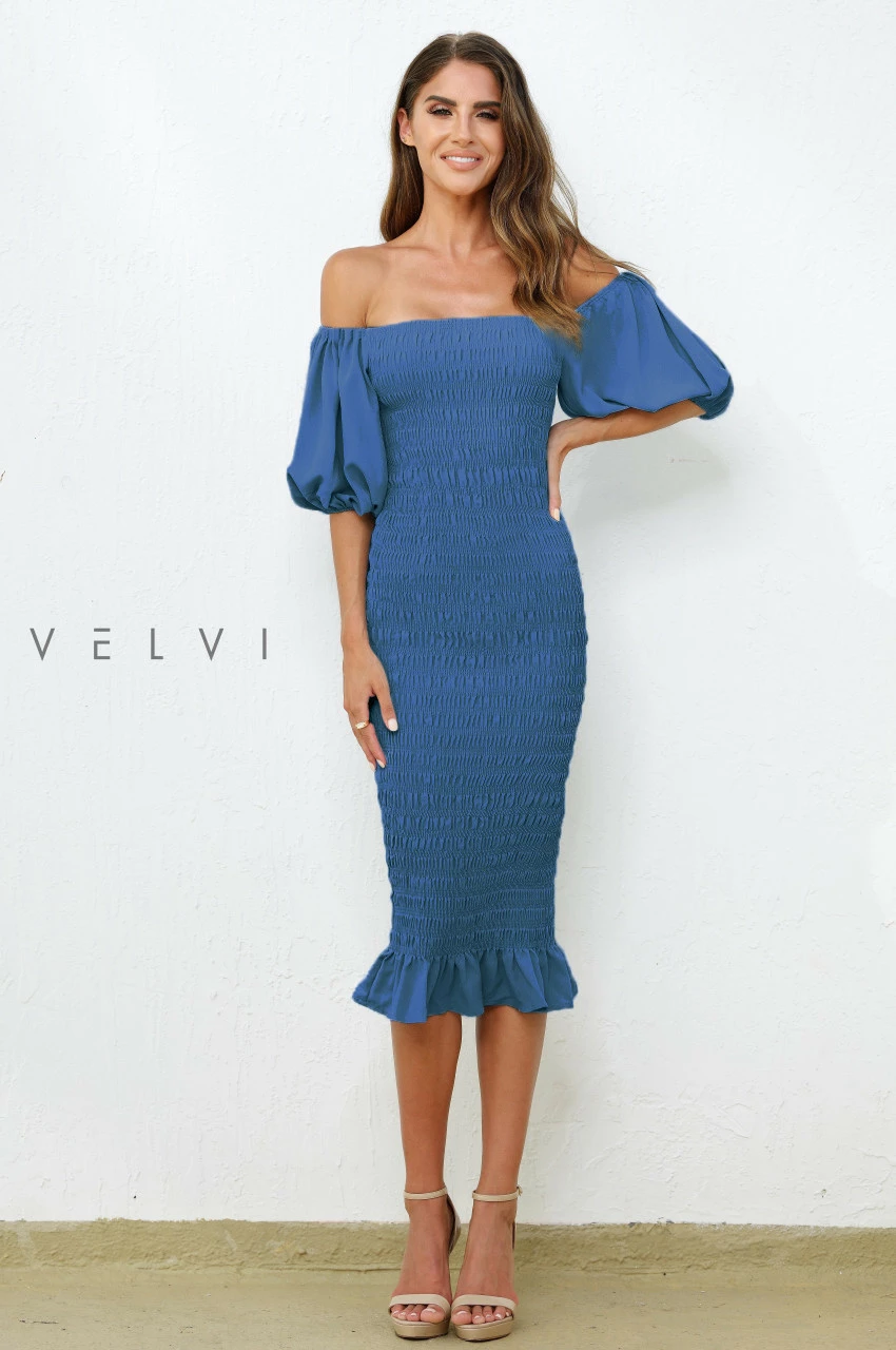 The Skyla Shirred Midi Dress in Navy by Velvi is a simple and elegant style that you’ll feel your best in! Adding a hint of drama with the puff lantern sleeve detail and a shirred body style makes it the perfect wear-all-day style.